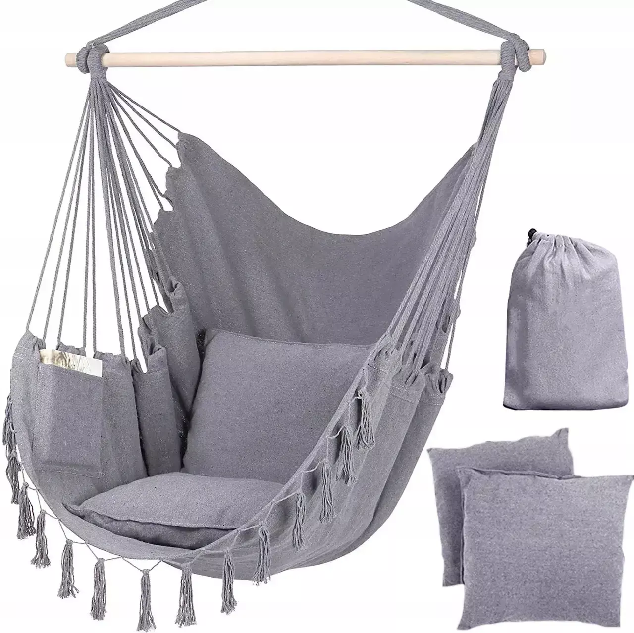 Також гамак чудово доповнить дизайн інтер'єру завдяки універсальним кольорам, красивим плетеним мотузкам та бахромі, що нагадує дуже модний стиль бохо.